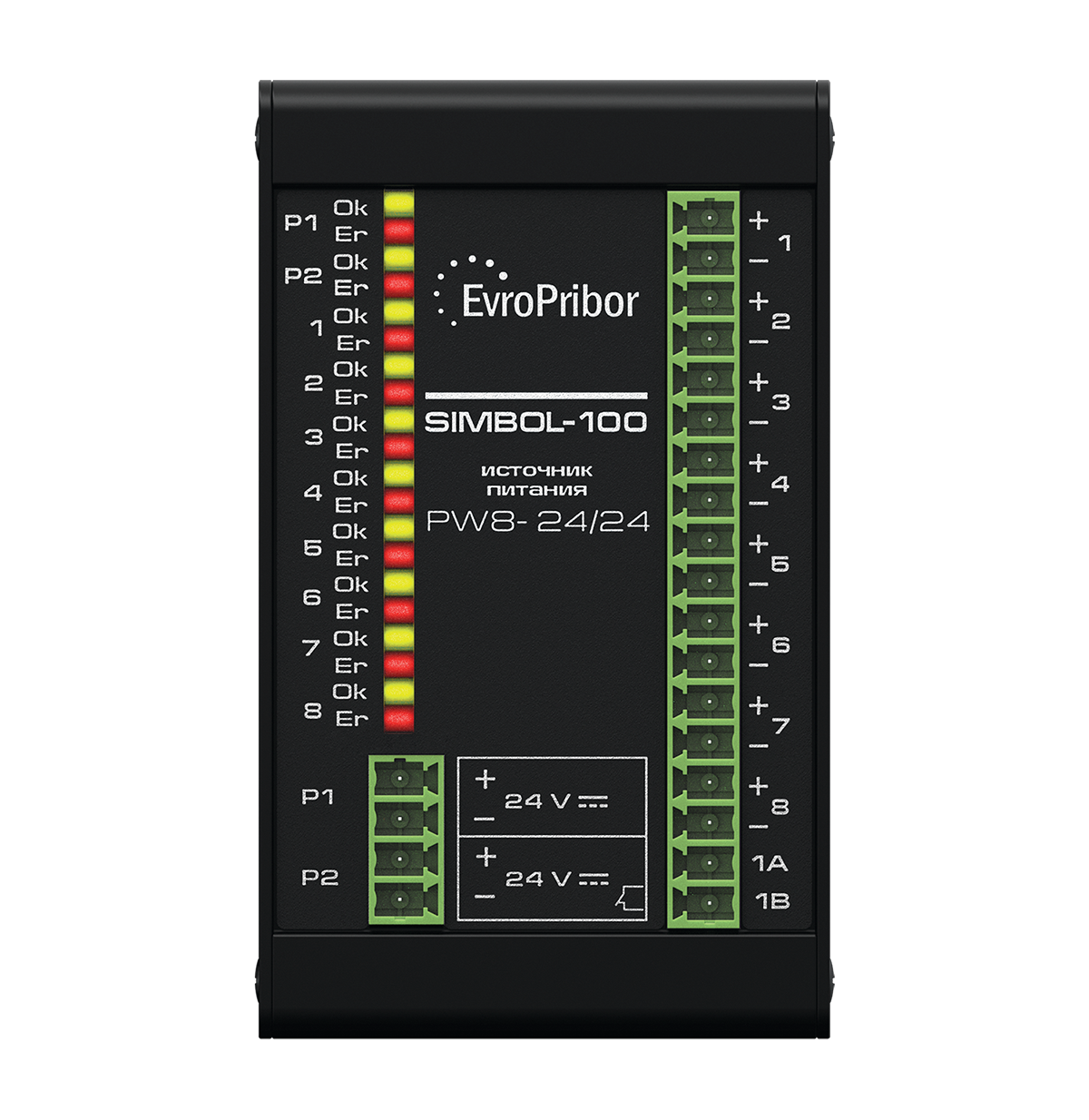 - PW8 имеет 8 (восемь) независимых гальванически изолированных выходных каналов напряжением 24 В и током нагрузки до 25 мА каждый.