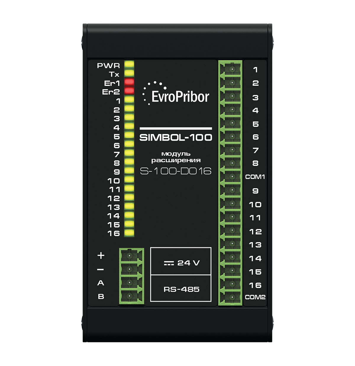 - Модуль имеет 16 выходных каналов типа интеллектуальные полупроводниковые ключи с изолированным затвором N-типа и один интерфейсный канал RS-485 для приема управляющих данных из информационной сети или от ПК.