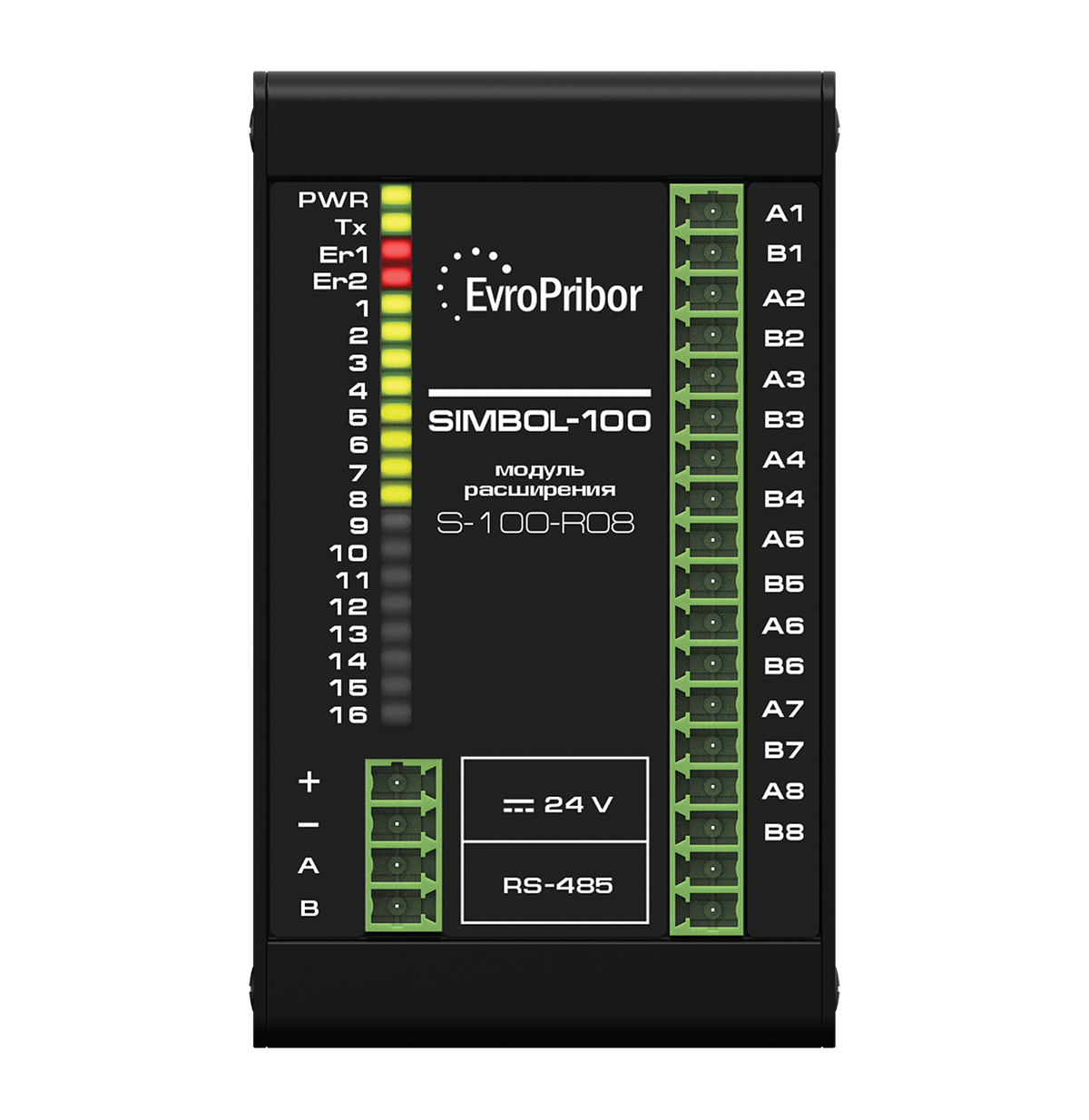 - Модуль имеет 8 выходных каналов типа нормально-разомкнутый контакт реле и один интерфейсный канал RS-485 для приема управляющих данных из информационной сети или от ПК.