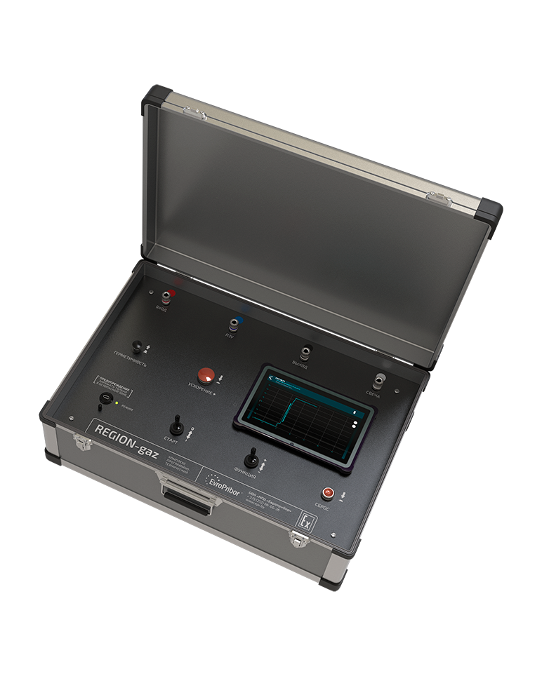 - ПТК «REGION-gaz» позволяет полностью проверить работу регулятора давления газа, герметичность мембраны ПЗК, верхнее и нижнее значения давления срабатывания ПЗК, давление срабатывания ПСК и его закрытие, герметичность кранов и другой запорной арматуры.